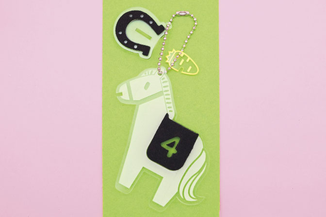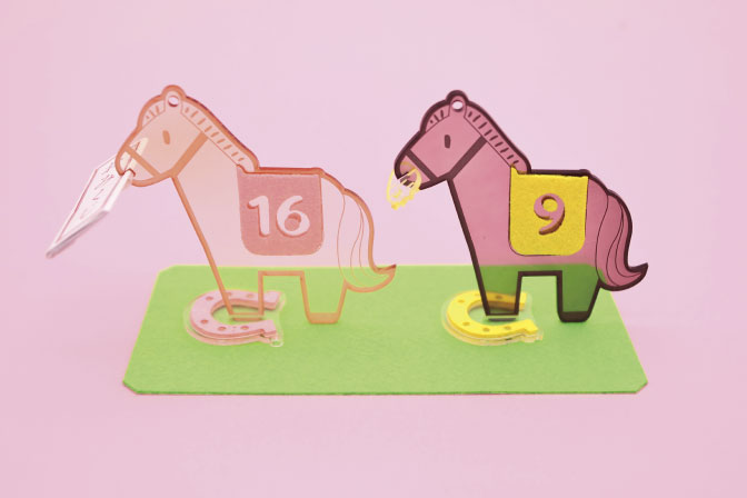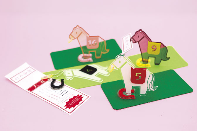 2026年の干支・午のアクリルスタンドです。おみくじやメモを馬の口にくわえさせることができます。ゼッケンに文字や数字をレーザーカッターで刻印する様子を見られます。大吉が出たらおまけのプレゼントもあります!