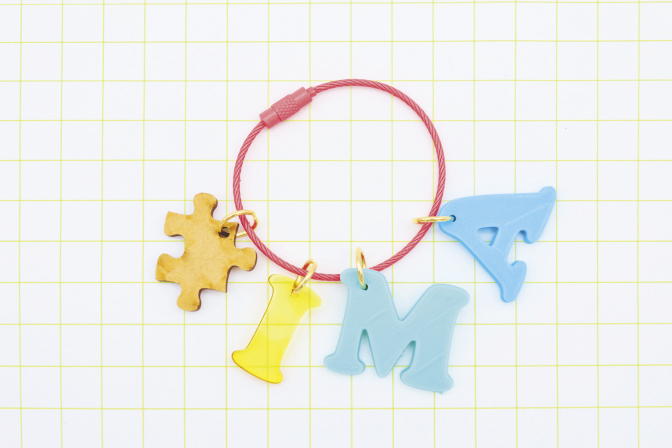 お好みのアルファベットや数字のチャームをワイヤーリングに通してつくる体験